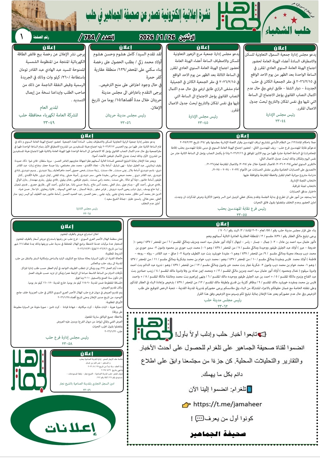 نشرة إعلانية إلكترونية العدد رقم 784 ليوم الاثنين 26– 1–2026. أحدث الأخباراعلانات Last updated يناير 26, 2026 Share نشرة إعلانية إلكترونية العدد رقم 784 ليوم الاثنين 26– 1–2026 Share FacebookTwitterGoogle+ReddItWhatsAppPinterestالبريد الإلكتروني