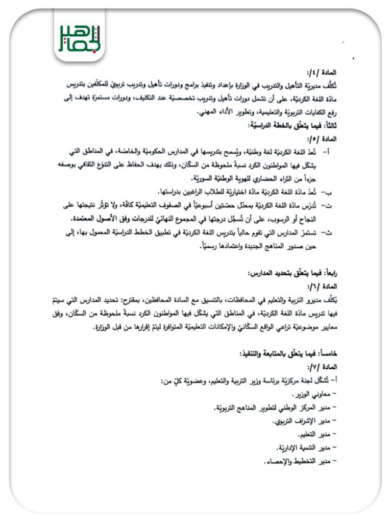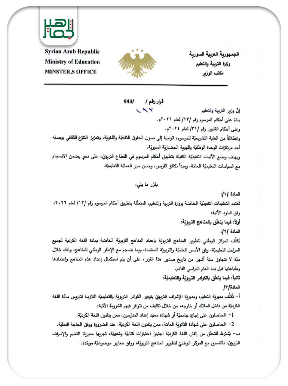 وزارة التربية تصدر قرار بالتعليمات التنفيذيّة المتعلّقة بتطبيق أحكام المرسوم رقم 13 لعام 2026، المتضمن إعداد مناهج تربوية للغة الكردية وتوفير كوادر تعليمية مؤهلة ووضعها في الخطة الدراسيّة، كما هو موضح في نص القرار تعليم Last updated يناير 26, 2026 Share Share FacebookTwitterGoogle+ReddItWhatsAppPinterestالبريد الإلكتروني