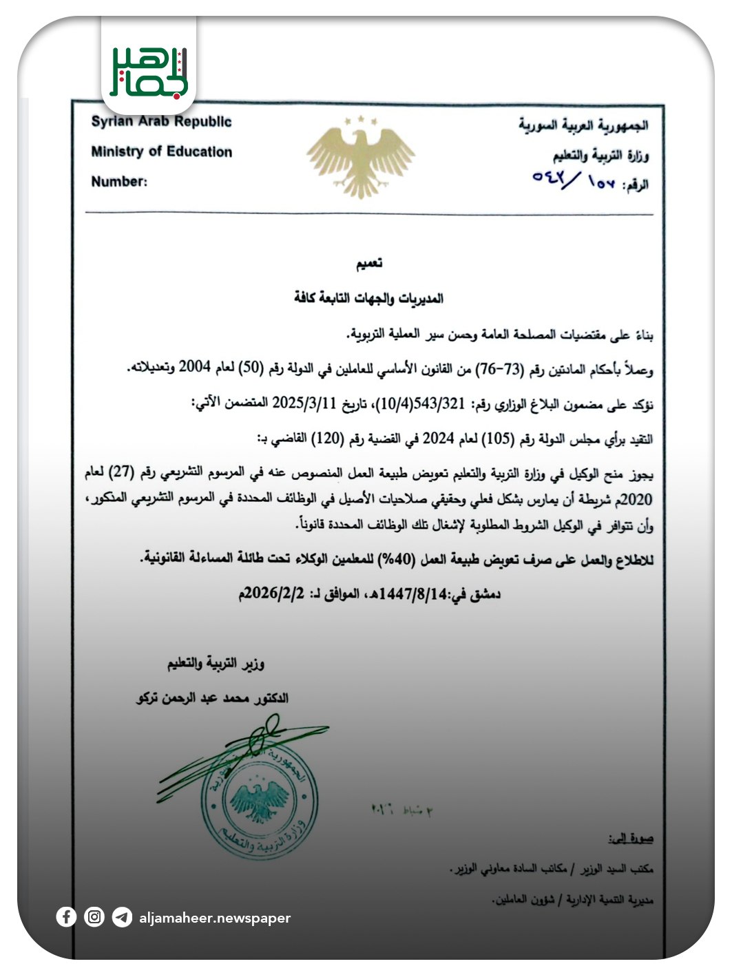 وزارة التربية والتعليم : توجّه الوزارة مديريات التربية والتعليم بصرف تعويض طبيعة عمل بنسبة 40% وفقاً لما هو منصوص عليه في المرسوم التشريعي رقم 27 لعام 2020