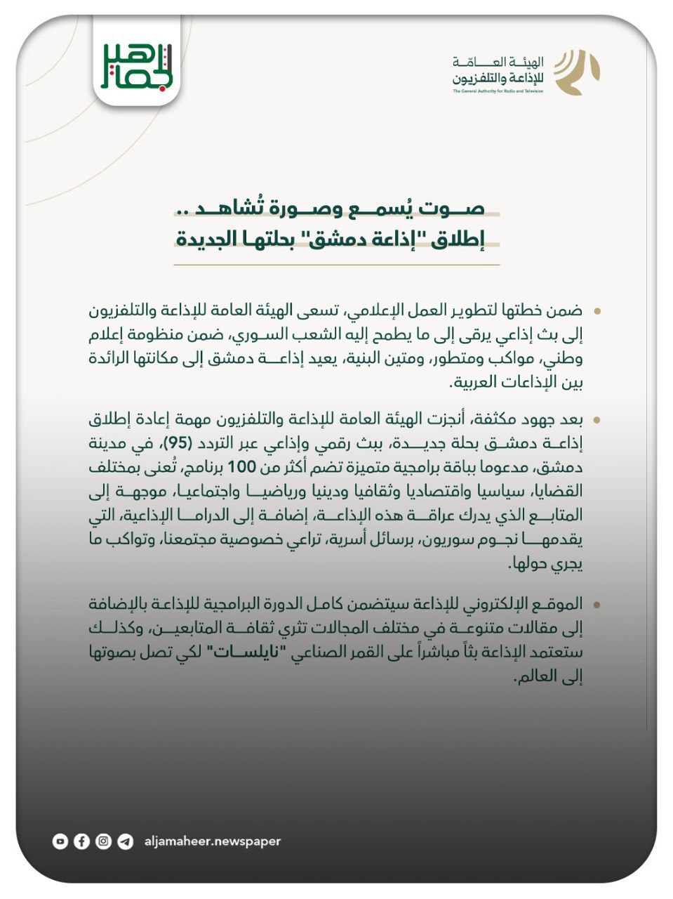 الهيئة العامة للإذاعة والتلفزيون تصدر بيان انطلاقة إذاعة دمشق بحلتها الجديدة بهوية بصرية وسمعية تمزج الحداثة بالأصالة وتقدم محتوى يعيد الإذاعة إلى مكانتها الرائدة أحدث الأخبار On فبراير 4, 2026 Share Share FacebookTwitterGoogle+ReddItWhatsAppPinterestالبريد الإلكتروني