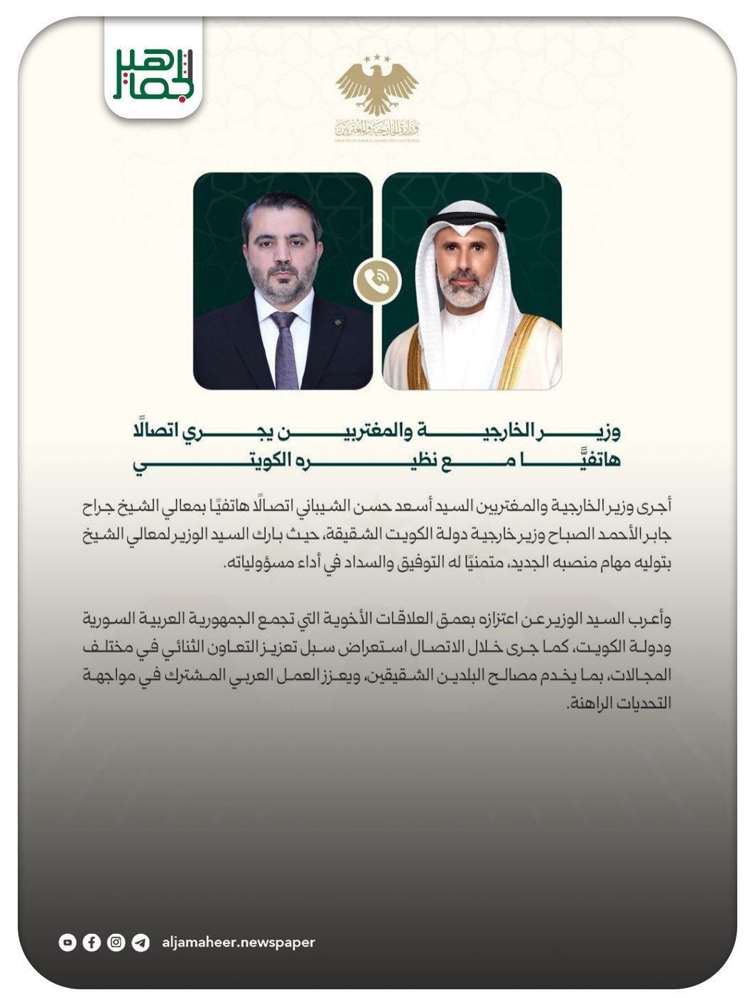 وزير الخارجية أسعد الشيباني يجري اتصالاً هاتفياً مع نظيره الكويتي الشيخ جراح جابر الأحمد الصباح أحدث الأخبار On فبراير 9, 2026 Share 📌 بحثوا سبل تعزيز التعاون الثنائي في مختلف المجالات، بما يخدم مصالح البلدين الشقيقين، ويعزز العمل العربي المشترك. 🔔 اشترك بقناة التيليجرام: https://t.me/jamaheer Share FacebookTwitterGoogle+ReddItWhatsAppPinterestالبريد الإلكتروني