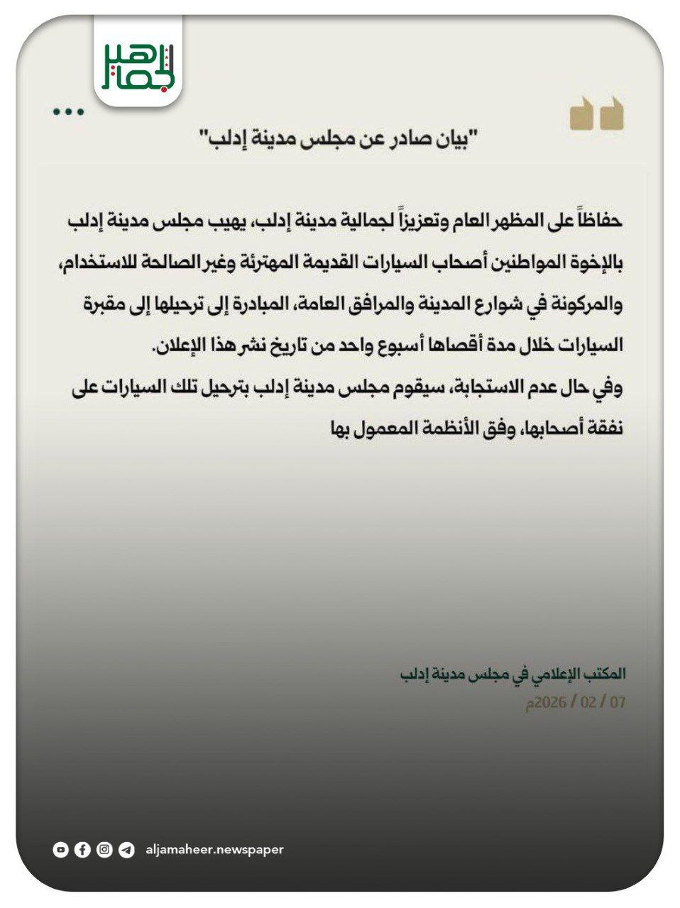 مجلس مدينة إدلب يوجّه تنبيهاً لأصحاب السيارات القديمة والمهترئة بضرورة ترحيلها من شوارع المدينة حفاظاً على المظهر العام. أحدث الأخبار On فبراير 10, 2026 Share Share FacebookTwitterGoogle+ReddItWhatsAppPinterestالبريد الإلكتروني