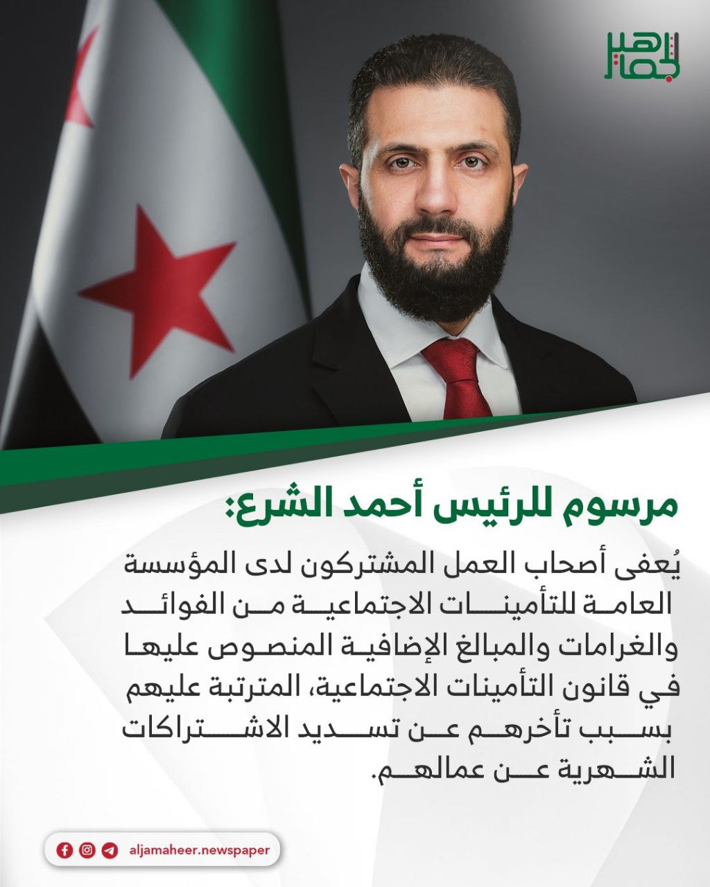 مرسوم رئاسي بإعفاء أصحاب العمل المشتركون لدى المؤسسة العامة للتأمينات من غرامات تأخرهم عن تسديد الاشتراكات الشهرية عن عمالهم