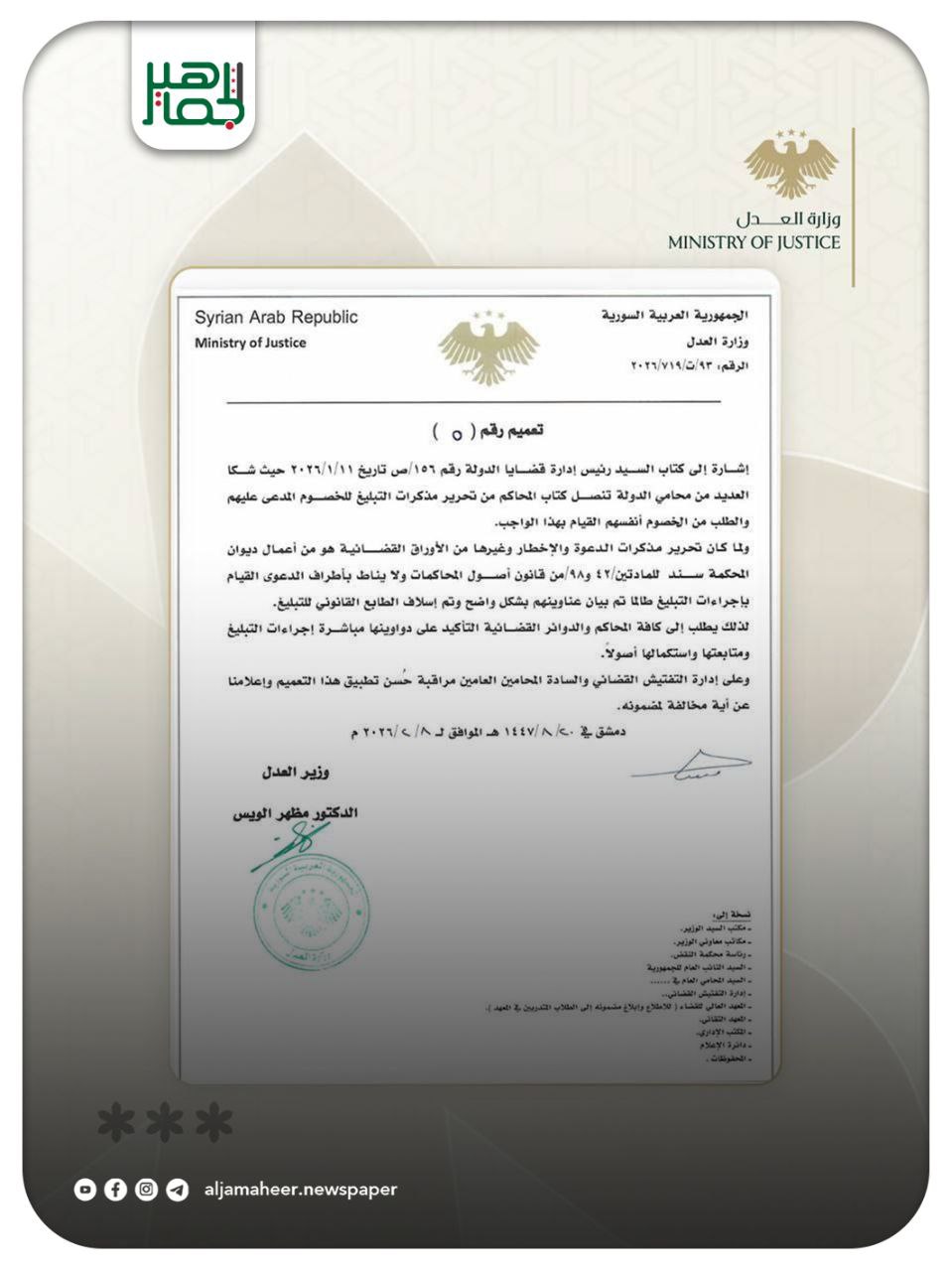 تعميم رقم (5) من وزارة العدل بتأكيد مسؤولية دواوين المحاكم في تحرير مذكرات التبليغ للخصوم محليات On فبراير 11, 2026 Share Share FacebookTwitterGoogle+ReddItWhatsAppPinterestالبريد الإلكتروني