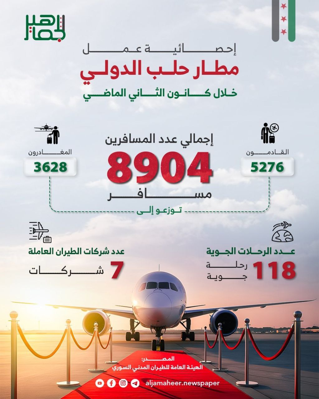 أعداد القادمون تفوق المغادرون إحصائية حركة مطار حلب الدولي خلال كانون الثاني الماضي. عين الجماهير On فبراير 12, 2026 Share Share FacebookTwitterGoogle+ReddItWhatsAppPinterestالبريد الإلكتروني