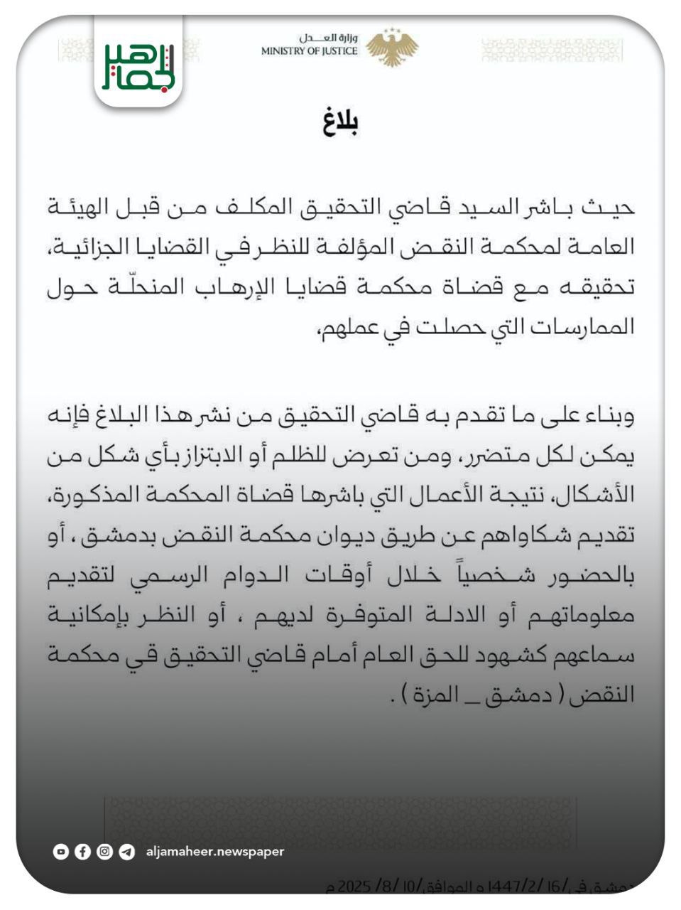 وزارة العدل تمدد مهلة تقديم الشكاوى بحق قضاة محكمة الإرهــ.ــاب بموجب البلاغ الصادر بتاريخ 10/8/2025 حتى 11/3/2026، لمن يرغب من المواطنين الذين تعرضوا للظلم أو الابتزاز نتيجة أعمال قضاة محكمة الإرهــ.ــاب بتقديم شكاواهم أو ادعاءاتهم. أحدث الأخبار On فبراير 12, 2026 Share Share FacebookTwitterGoogle+ReddItWhatsAppPinterestالبريد الإلكتروني