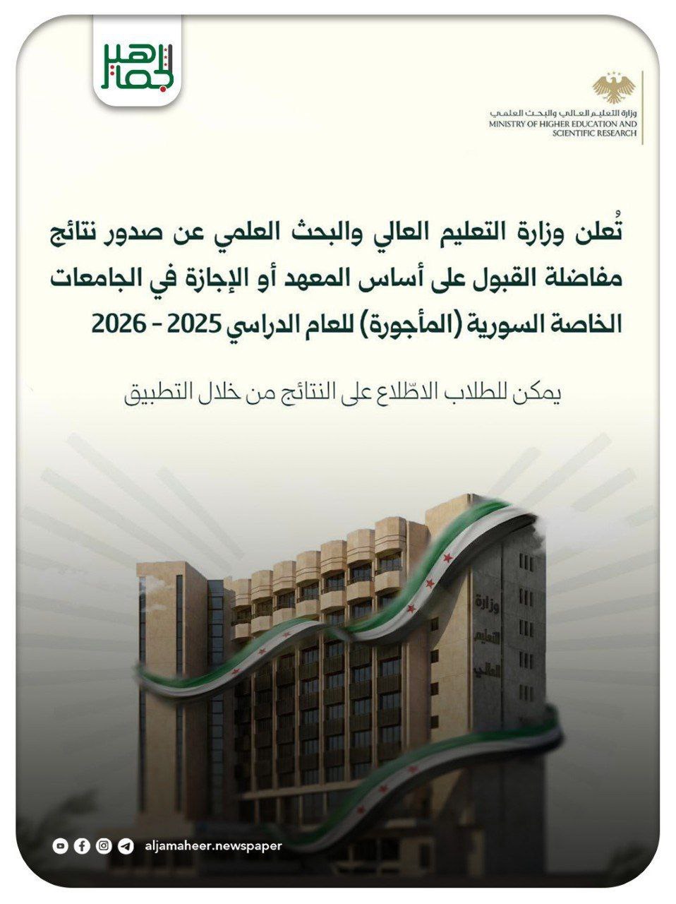 تُعلن وزارة التعليم العالي والبحث العلمي عن صدور نتائج مفاضلة القبول على أساس المعهد أو الإجازة في الجامعات الخاصة السورية (المأجورة) للعام الدراسي 2025 – 2026