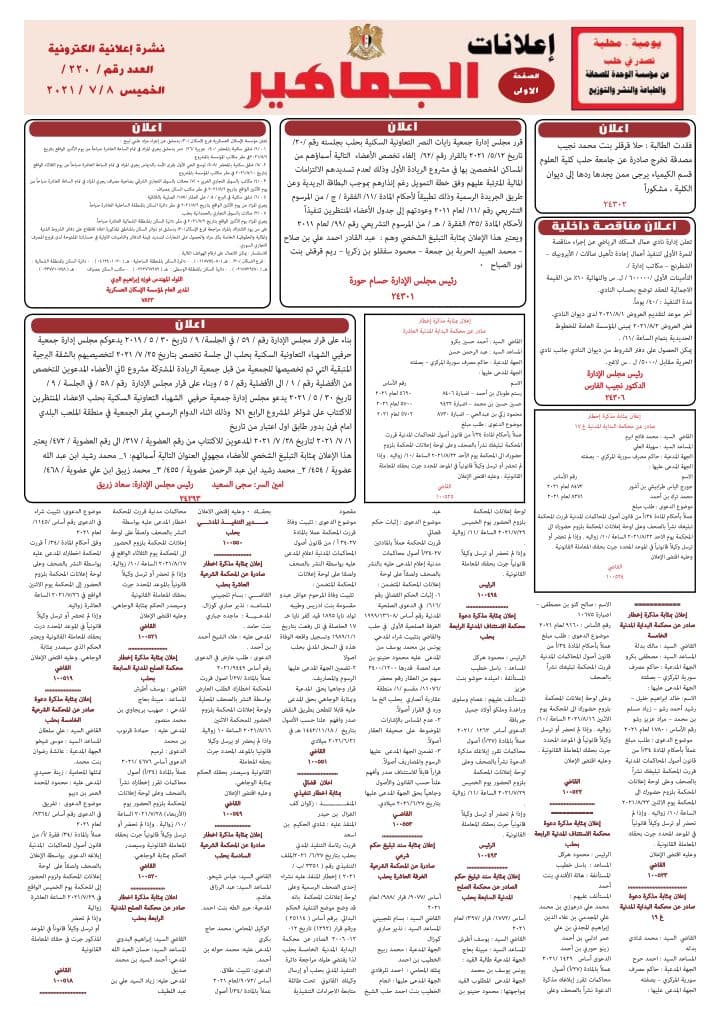 إعلانات الجماهير نشرة إعلانية الكترونية العدد رقم /220/ ثلاث صفحاات الخميس 8-7-2021 اعلانات On يوليو 7, 2021 Share Share FacebookTwitterGoogle+ReddItWhatsAppPinterestالبريد الإلكتروني