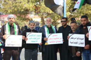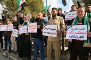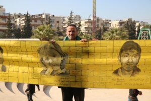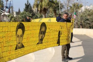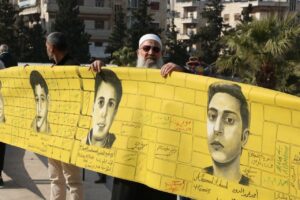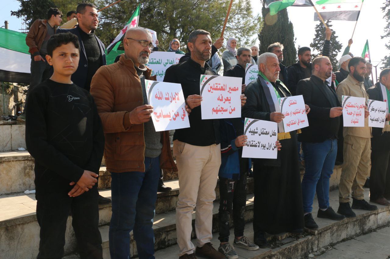 نظّم نشطاء في محافظة إدلب، اليوم الإثنين 17 شباط، وقفةً تضامنيةً للتأكيد على حقوق المعتقلين والمغيبين قسراً في سجون النظام البائد خلال فترة حكمه ومحاسبة مرتكبي الجرائم، كما وقّع الحاضرون على وثيقة لتقديم شكوى رسمية ضد المجرم بشار الأسد وأركانه.