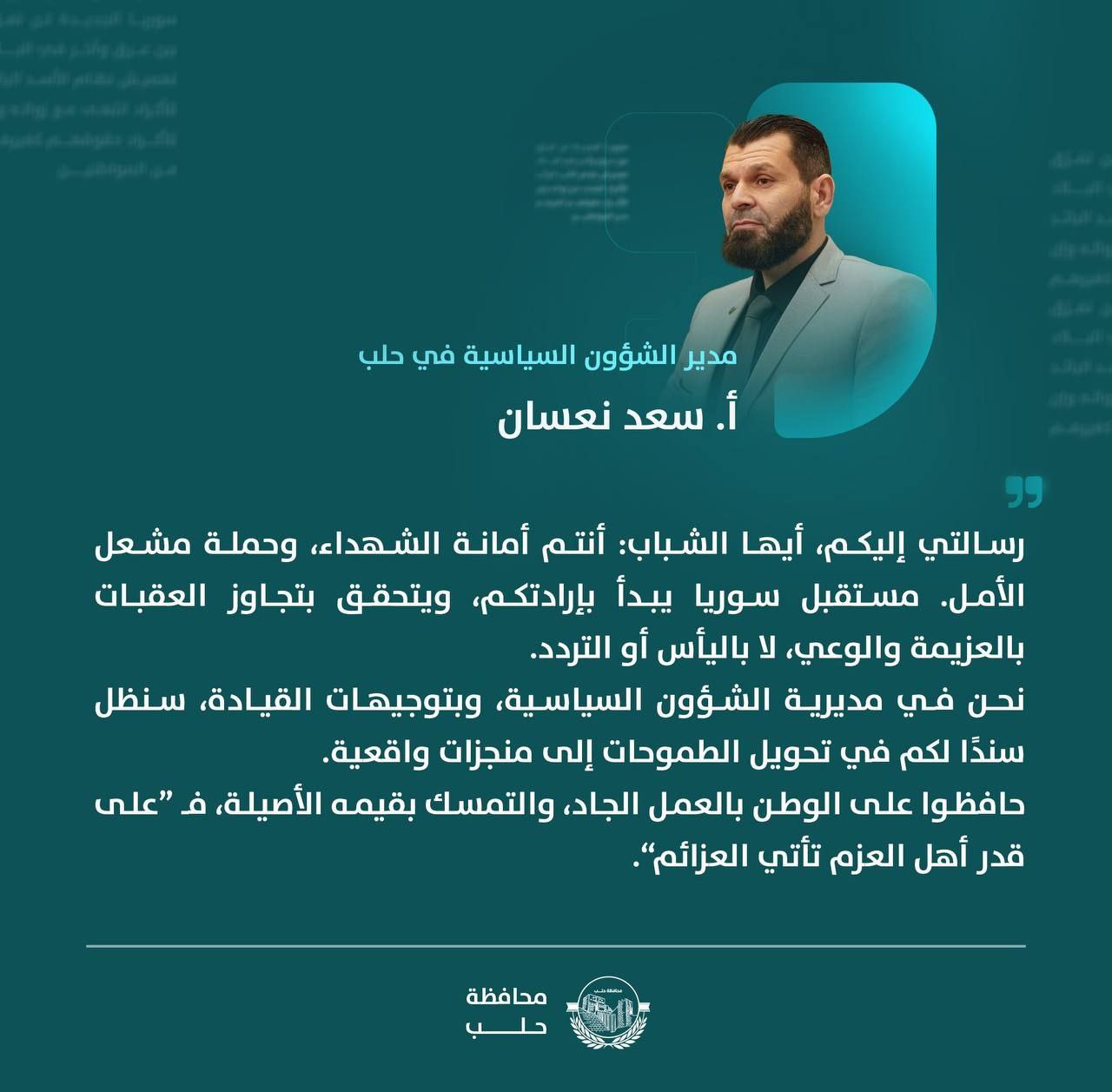 أنتم أمانة الشهداء، وحملة مشعل الأمل. مستقبل سوريا يبدأ بإرادتكم، ويتحقق بتجاوز العقبات بالعزيمة والوعي، لا باليأس أو التردد.