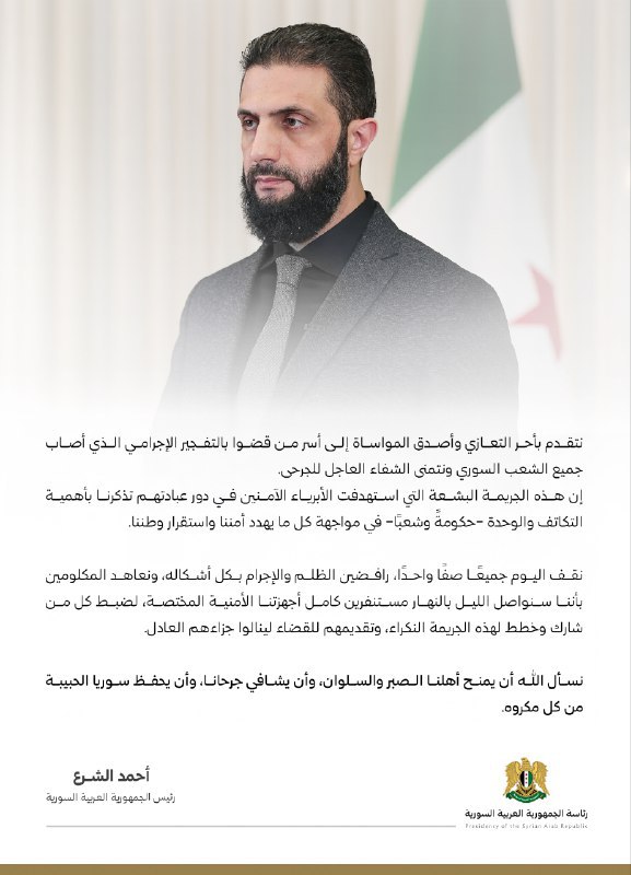 رئيس الجمهورية السيد أحمد الشرع يعزّي أُسر من قضوا بتفجير كنيسة مار إلياس بحي الدويلعة في دمشق محليات On يونيو 23, 2025 Share #جرح_الدويلعة_جرح_وطن #صحيفة_الجماهير Share FacebookTwitterGoogle+ReddItWhatsAppPinterestالبريد الإلكتروني