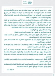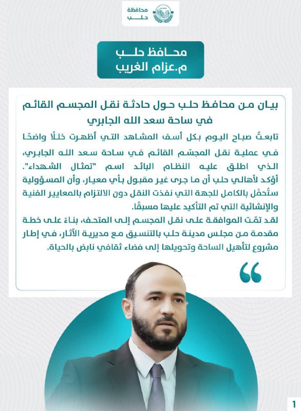 بيان محافظ حلب المهندس عزام الغريب حول حادثة نقل المجسم القائم في ساحة سعد الله الجابري محليات Last updated يوليو 3, 2025 Share #صحيفة_الجماهير Share FacebookTwitterGoogle+ReddItWhatsAppPinterestالبريد الإلكتروني