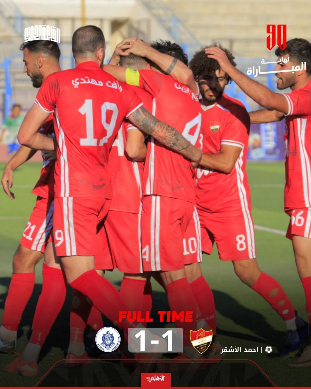 ⚽️| أهلي حلب ينهي منافسات دوري الرجال المنتظم لكرة القدم بالتعادل الإيجابي بهدف لمثله مع حطين، وذلك في الجولة الحادية عشرة و الأخيرة. ليحتل المركز الثاني على لائحة ترتيب فرق الدوري، ويضرب موعداً مع صاحب المركز الثالث في الدور النهائى الذي ستقام منافساته بدمشق.