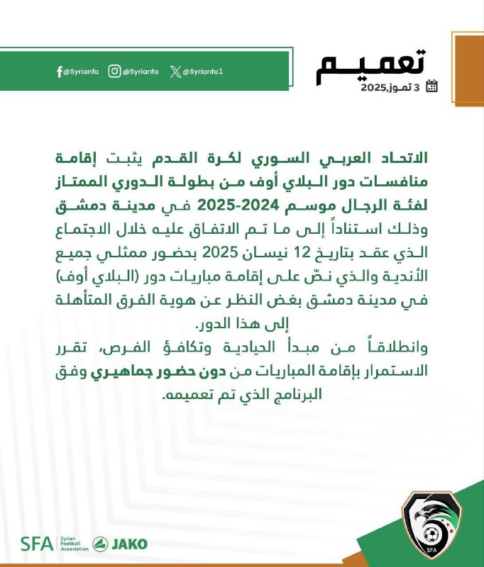 رداً على الكتب الواردة من أندية الكرامة وأهلي حلب وحطين المتضمنة رغبتها بنقل مباريات دور “البلاي أوف” للدوري الممتاز لفئة الرجال إلى خارج مدينة دمشق، ثبت الاتحاد العربي السوري لكرة القدم، إقامة المباريات بدمشق استناداً إلى ما اتفق عليه في اجتماع ممثلي أندية الدرجة الممتازة الذي عقد بتاريخ 12 نيسان 2025 والذي نص على إقامة مباريات دور البلاي أوف في مدينة دمشق بغض النظر عن هوية الفرق المتأهلة..