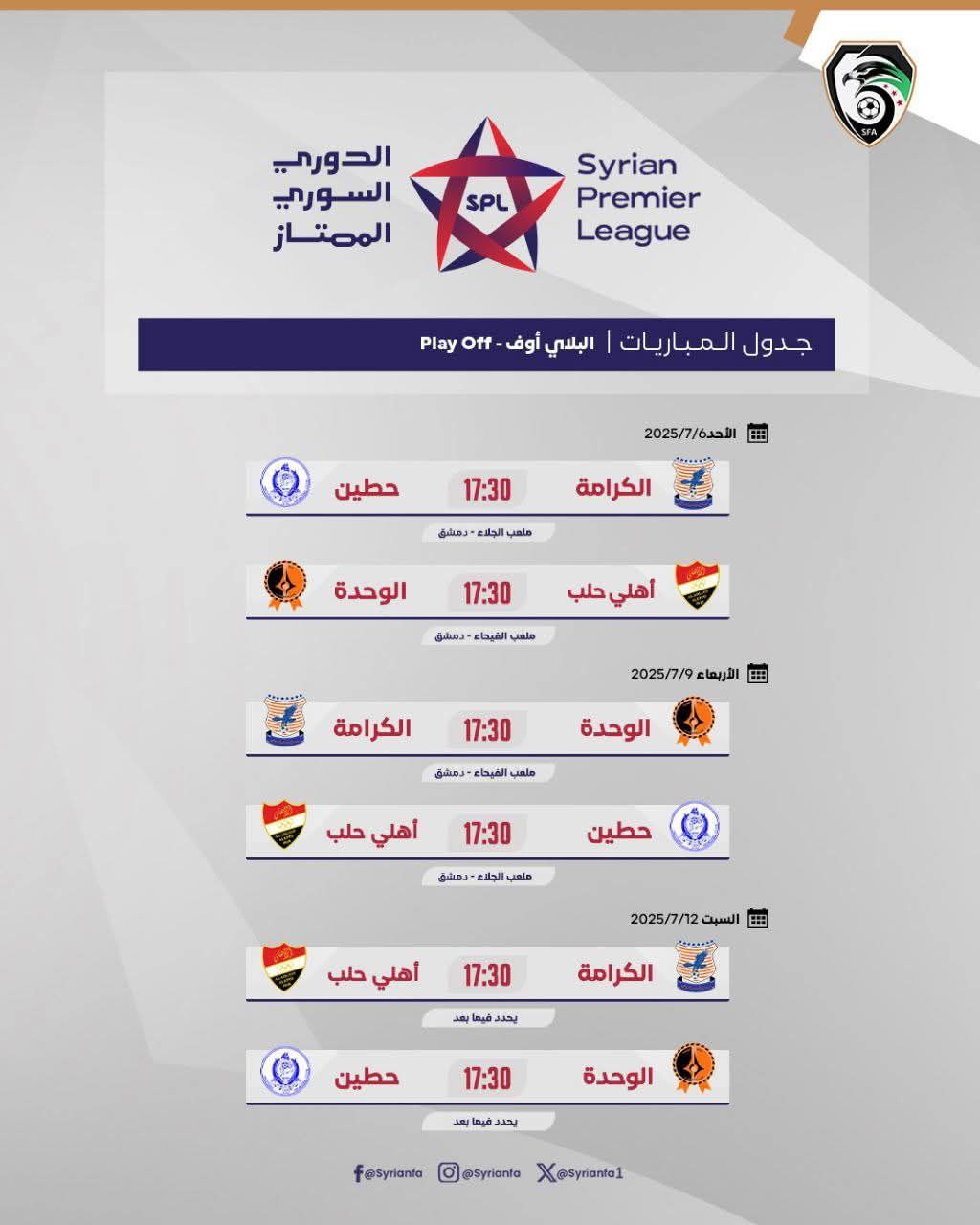 أصدر الاتحاد العربي السوري لكرة القدم، جدول مباريات دور البلاي أوف من الدوري السوري الممتاز لفئة الرجال موسم 2024-2025.