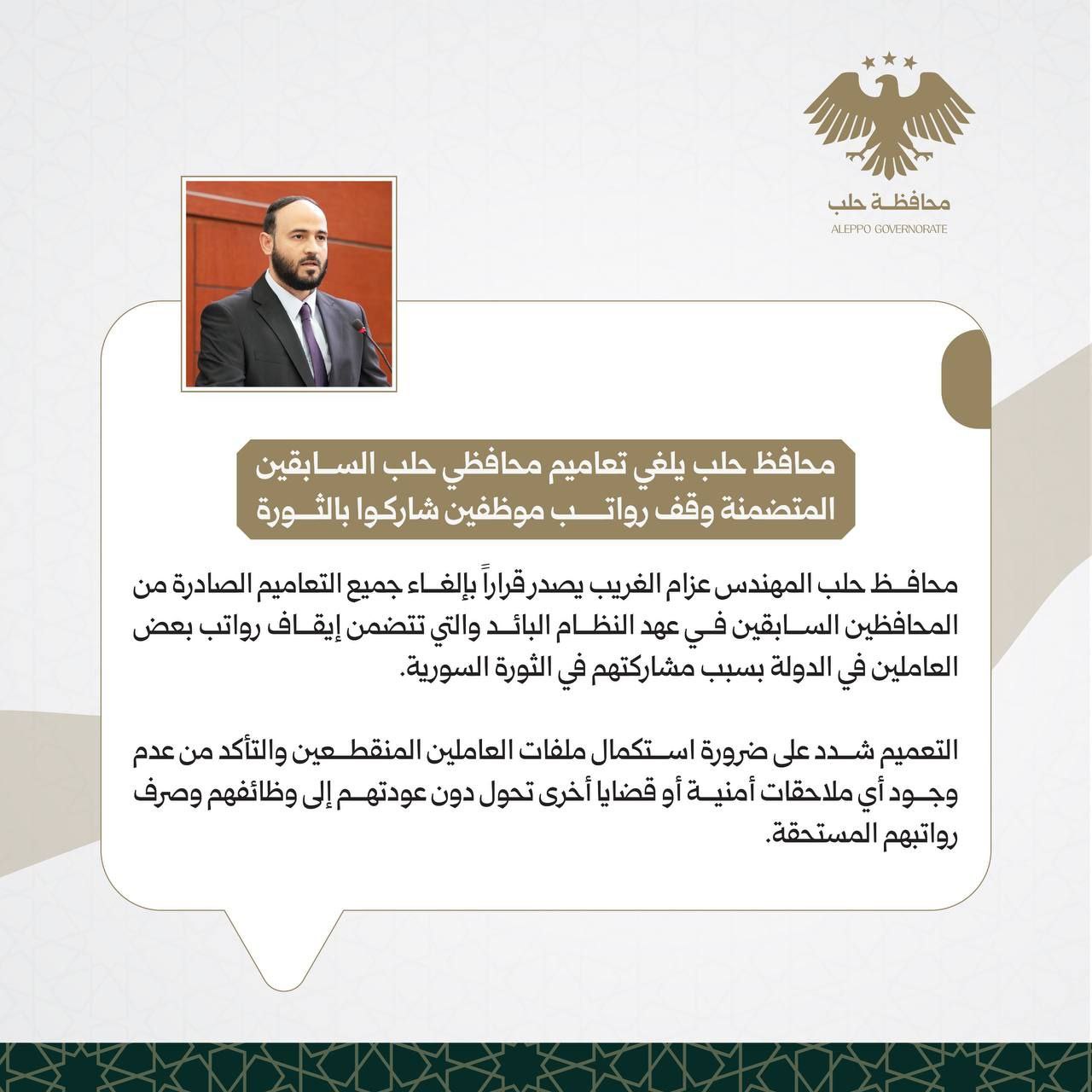 محافظ حلب يلغي تعاميم محافظي حلب السابقين المتضمنة وقف رواتب موظفين شاركوا بالثورة محليات On يوليو 7, 2025 Share #صحيفة_الجماهير Share FacebookTwitterGoogle+ReddItWhatsAppPinterestالبريد الإلكتروني