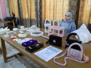 من بين المشاركين، الطالبة آية ريس (سنة ثانية هندسة كهربائية)، التي عرضت أعمالًا يدوية من الخرز تحت علامتها التجارية “رايَا ستور”. قالت: “بدأت المشروع قبل 6 أشهر وتعلمت الحرفة عبر الإنترنت”، معتبرة أن المعرض فرصة ممتازة للترويج لأعمالها وتعريف الآخرين بموهبتها.