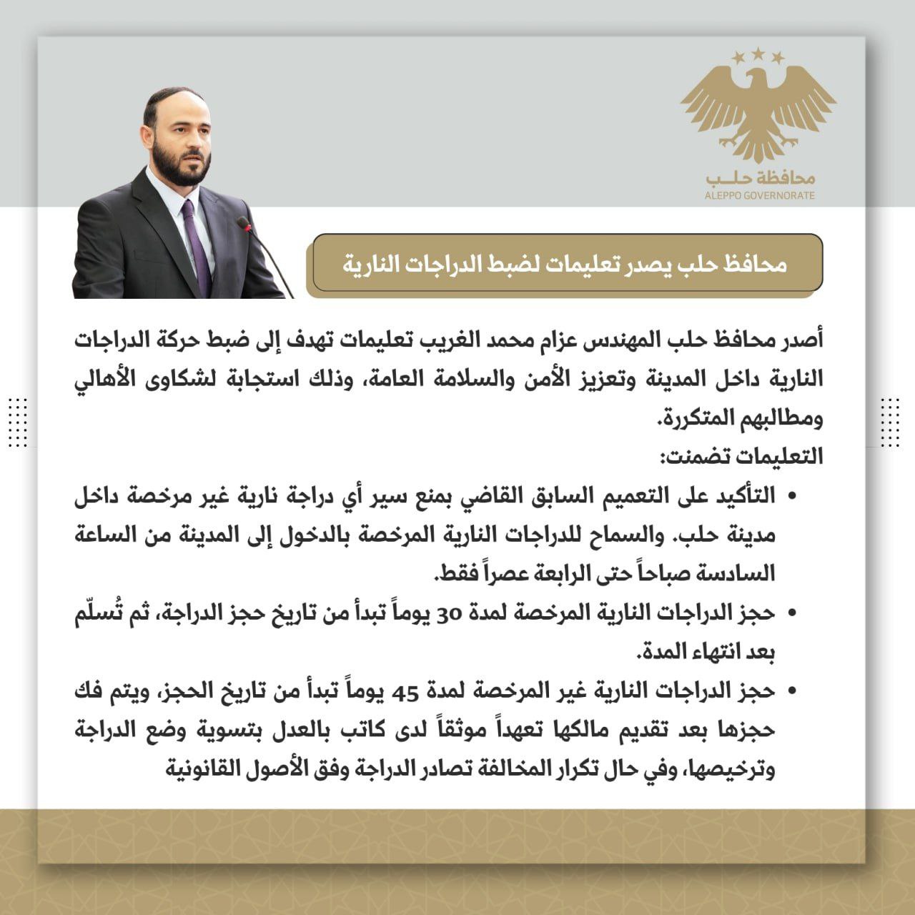 أصدر محافظ حلب المهندس عزام محمد الغريب تعليمات تهدف إلى ضبط حركة الدراجات النارية داخل المدينة وتعزيز الأمن والسلامة العامة، وذلك استجابة لشكاوى الأهالي ومطالبهم المتكررة.