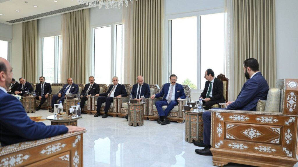 استقبل السيد أحمد الشرع، رئيس الجمهورية العربية السورية، وفدًا من اتحاد الغرف والبورصات السلعية في تركيا (TOBB)، برئاسة السيد رفعت حصارجيكلي أوغلو، رئيس اتحاد الغرف والبورصات التركية ورئيس الاتحاد العالمي للغرف (WCF)، وذلك في قصر الشعب بالعاصمة دمشق .