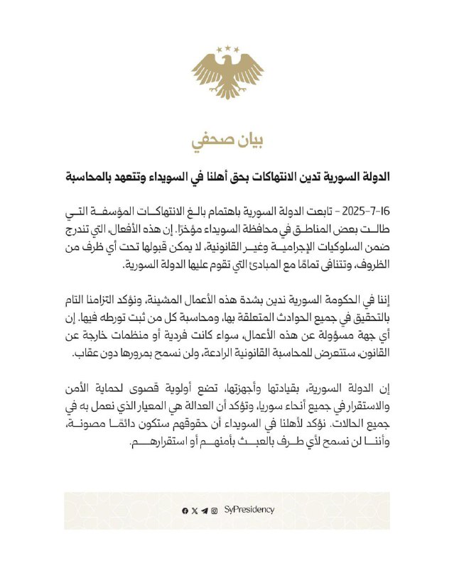 سوريا تدين الانتهاكات بحق أهلنا في السويداء وتتعهد بالمحاسبة أحدث الأخبار On يوليو 16, 2025 Share #صحيفة_الجماهير Share FacebookTwitterGoogle+ReddItWhatsAppPinterestالبريد الإلكتروني
