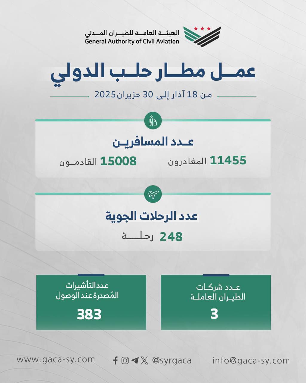 عمل مطار حلب الدولي خلال الأشهر الثلاثة الأولى من إعادة تشغيله، حيث شهد استئنافاً تدريجياً للرحلات الجوية في إطار خطة تهدف إلى تنشيط حركة النقل الجوي وتوسيع شبكة الربط مع عدد من العواصم والمدن الإقليمية.