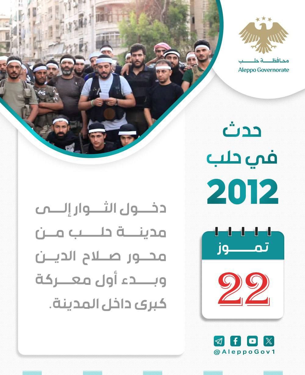 دخول الثوار إلى مدينة حلب من محور صلاح الدين وبدء أول معركة كبرى داخل المدينة. محليات On يوليو 22, 2025 Share #صحيفة_الجماهير Share FacebookTwitterGoogle+ReddItWhatsAppPinterestالبريد الإلكتروني