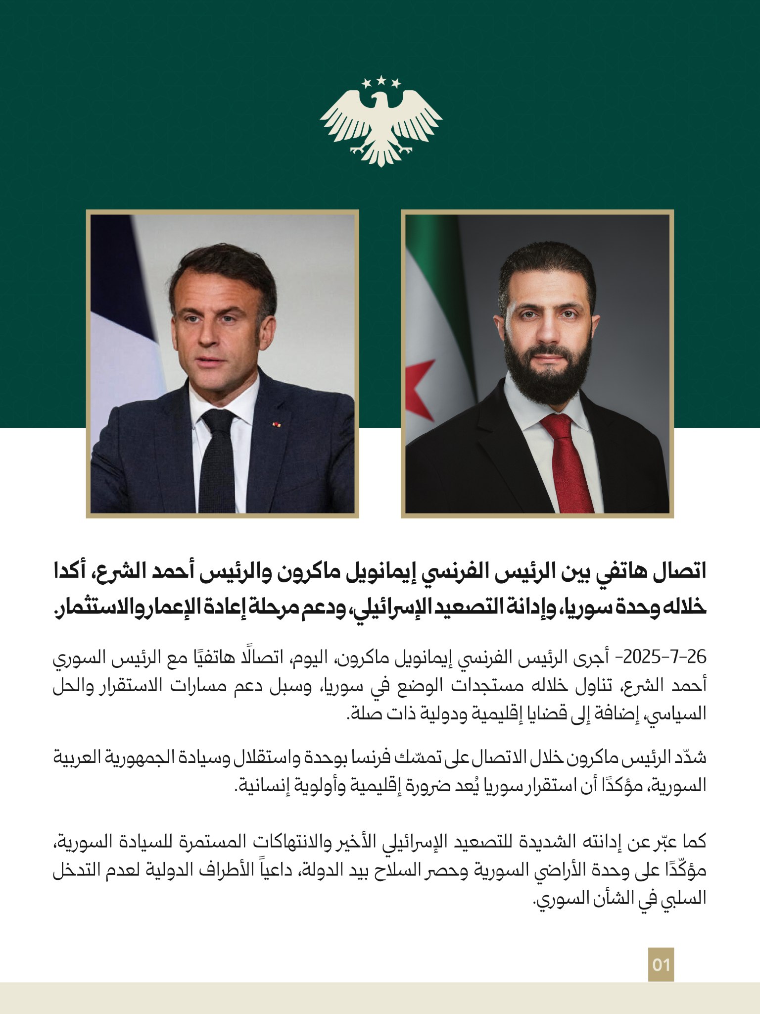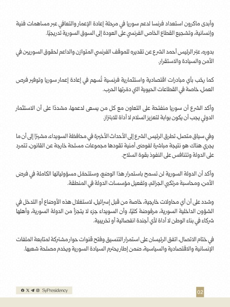 اتصال هاتفي بين الرئيس الفرنسي إيمانويل ماكرون والرئيس أحمد الشرع، أكدا خلاله وحدة سوريا، وإدانة التصعيد الإسرائيلي، ودعم مرحلة إعادة الإعمار والاستثمار. محليات On يوليو 26, 2025 Share #صحيفة_الجماهير Share FacebookTwitterGoogle+ReddItWhatsAppPinterestالبريد الإلكتروني