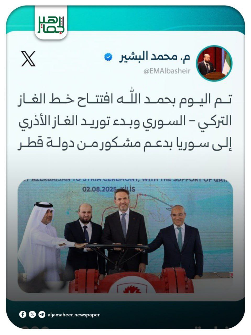 وزير الطاقة محمد البشير عبر منصة X أحدث الأخبار On أغسطس 2, 2025 Share 📌 تم اليوم بحمد الله افتتاح خط الغاز التركي – السوري وبدء توريد الغاز الأذري إلى سوريا بدعم مشكور من دولة قطر 📌 هذه الخطوة تمثل نقلة نوعية بتعزيز أمن الطاقة ودعم التعاون الإقليمي بين شركائنا في المنطقة #صحيفة_الجماهير Share FacebookTwitterGoogle+ReddItWhatsAppPinterestالبريد الإلكتروني