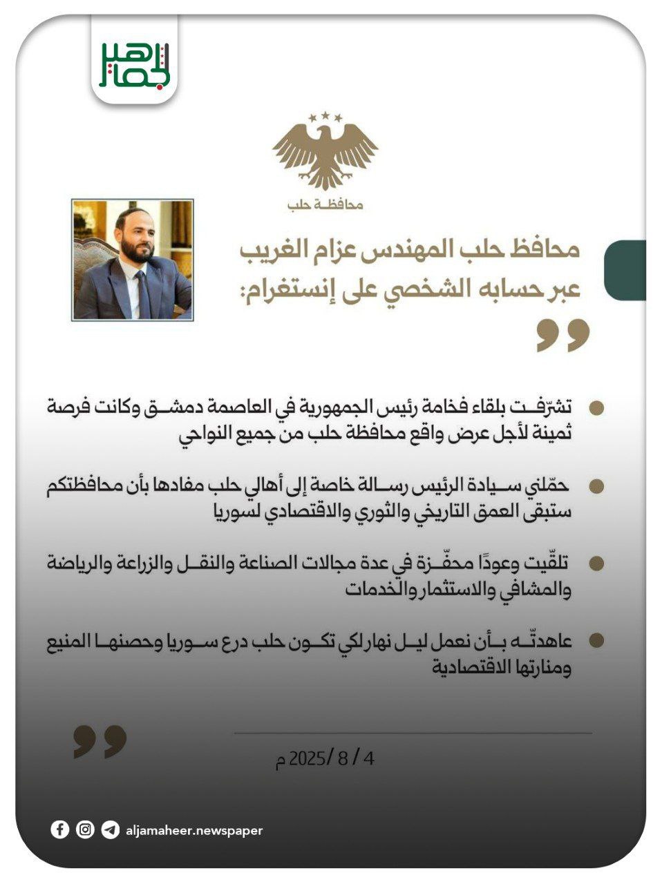 📌 حملني سيادة الرئيس رسالة خاصة إلى أهالي حلب مفادها بأن محافظتكم ستبقى العمق التاريخي والثوري والاقتصادي لسوريا تلقيت وعودًا محفّزة في عدة مجالات الصناعة والنقل والزراعة والرياضة و المشافي والاستثمار والخدمات.