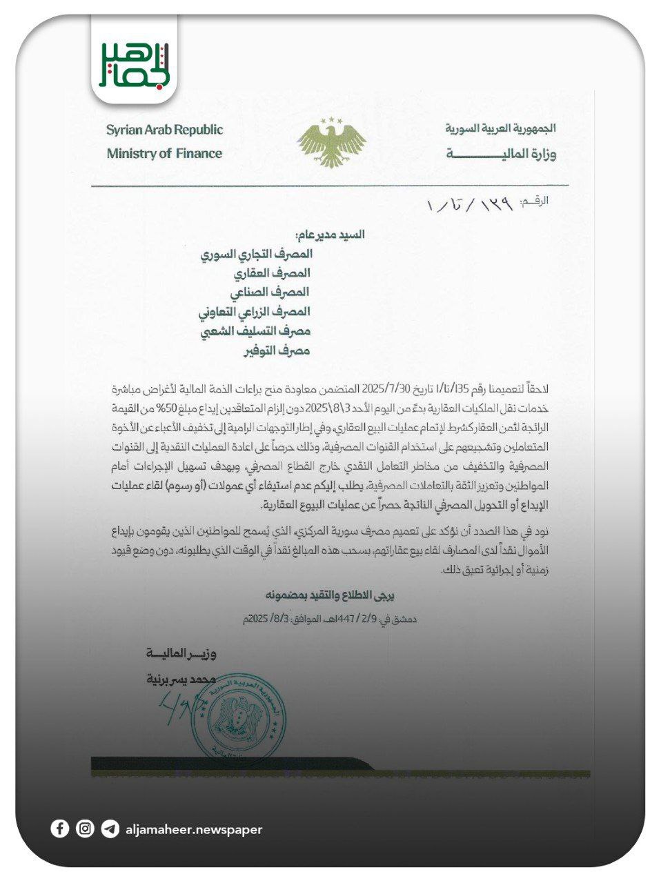وزارة المالية تؤكّد على إلغاء شرط الإيداع الإلزامي للبيوع العقارية وتطالب المصارف المملوكة للدولة بإلغاء أي رسوم أو عمولات تتعلق بعمليات إيداع أو سحب الأموال الناتجة عن ذلك دعماً وتشجيعاً على التعامل المصرفي أحدث الأخبار On أغسطس 5, 2025 Share Share FacebookTwitterGoogle+ReddItWhatsAppPinterestالبريد الإلكتروني