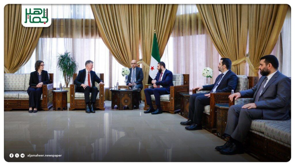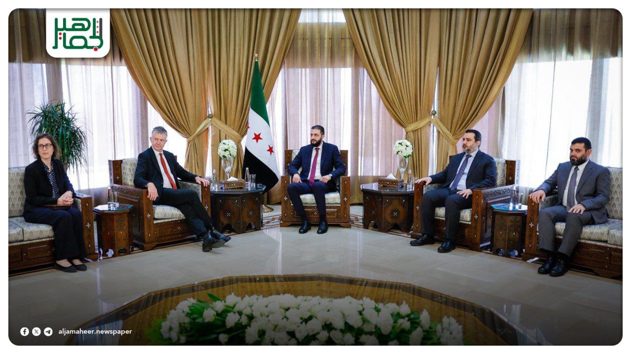 رئيس الجمهورية العربية السورية السيد أحمد الشرع، وبحضور وزير الخارجية والمغتربين السيد أسعد حسن الشيباني، ورئيس الاستخبارات العامة السيد حسين السلامة، يستقبل مستشار الأمن القومي البريطاني السيد جوناثان باول في العاصمة دمشق