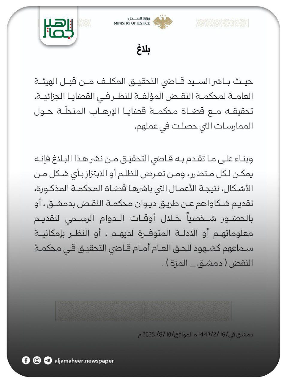 📌 ندعو المواطنين الذين تعرضوا للظلم أو الابتزاز نتيجة أعمال قضاة محكمة الإرهاب إلى تقديم شكاويهم