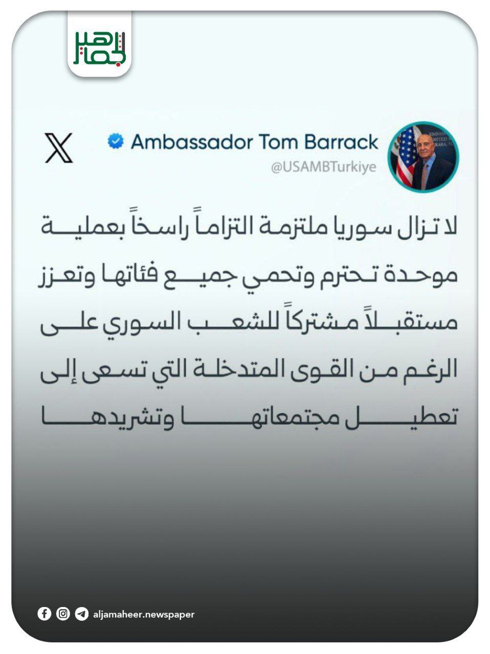 📌 لا تزال سوريا ملتزمة التزاماً راسخاً بعملية موحدة تحترم وتحمي جميع فئاتها وتعزز مستقبلاً مشتركاً للشعب السوري على الرغم من القوى المتدخلة التي تسعى إلى زعزعة الاستقرار وتهجير المجتمعات
