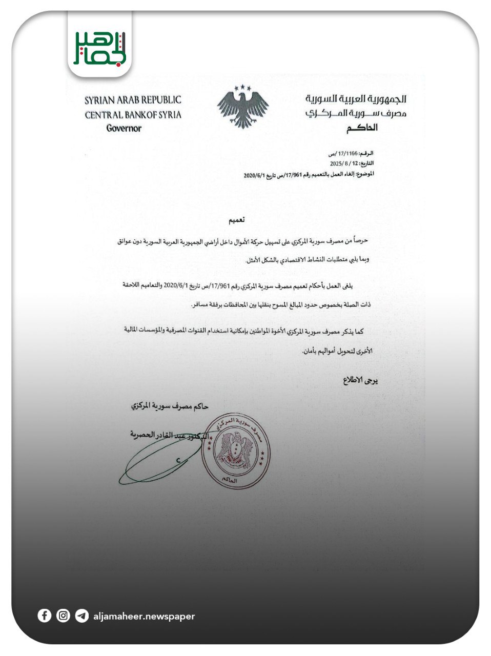 مصرف سوريا المركزي يصدر تعميماً بإلغاء حدود المبالغ المسموح بنقلها بين المحافظات برفقة مسافر كما يذكر المواطنين بإمكانية استخدام القنوات المصرفية والمؤسسات المالية الأخرى لتحويل أموالهم بأمان. اقتصاد On أغسطس 13, 2025 Share #صحيفة_الجماهير Share FacebookTwitterGoogle+ReddItWhatsAppPinterestالبريد الإلكتروني