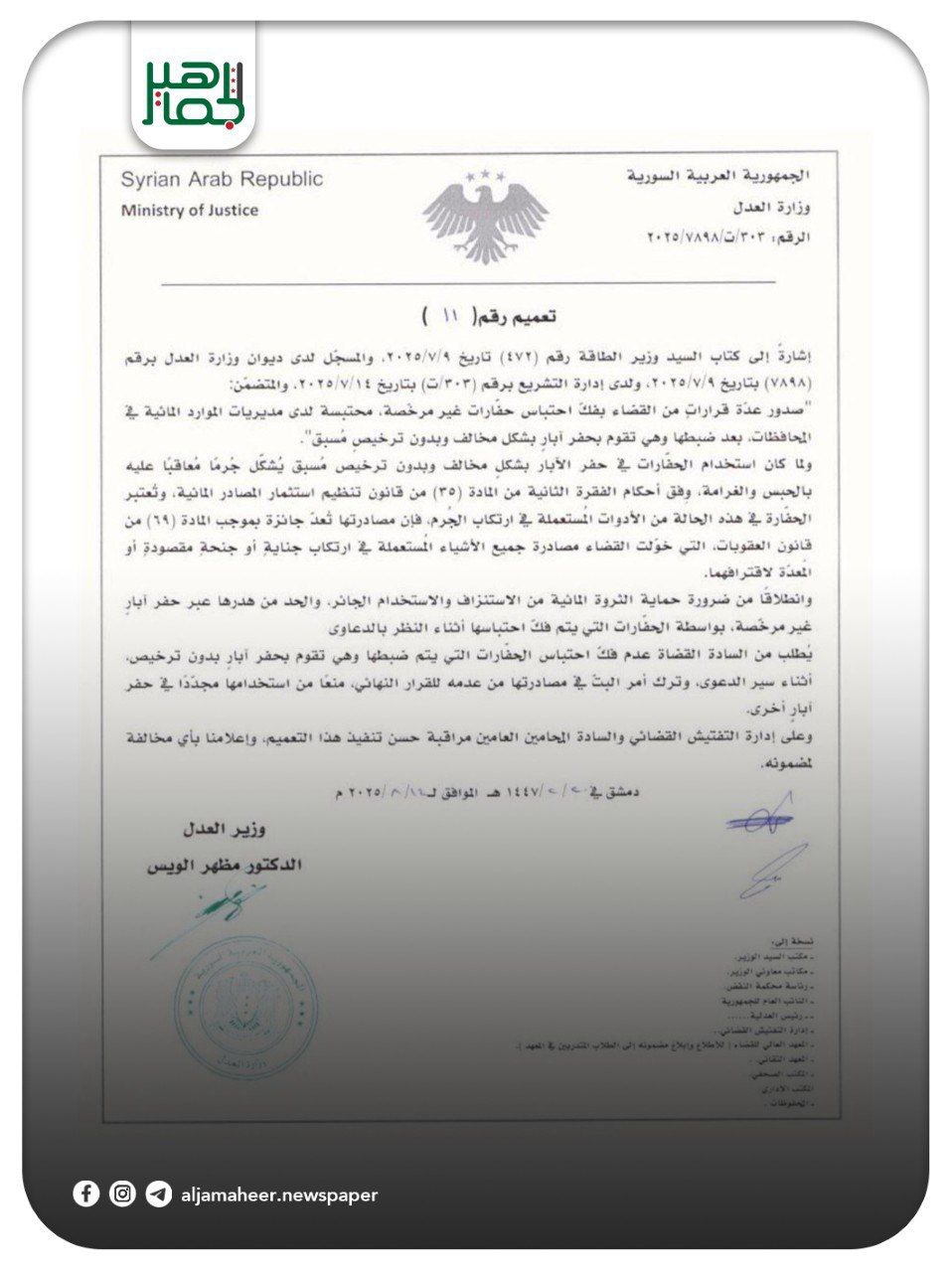 📌انطلاقاً من ضرورة حماية الثروة المائية من الاستنزاف والاستخدام الجائر، والحد من التعديات على المياه الجوفية عبر حفر الآبار بشكل عشوائي ومخالف للقانون، أصدرت وزارة العدل التعميم رقم (11).