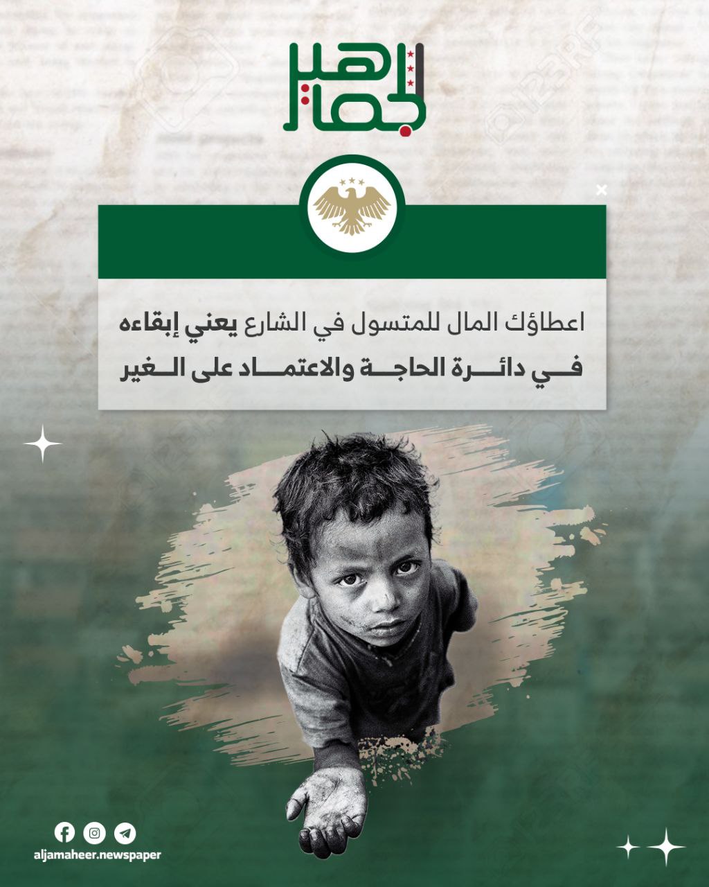 لا تساهم في بقاء ظاهرة التسول غير مصنف On أغسطس 17, 2025 Share أعطاؤك المال للمتسول في الشارع يساهم في استمرار هذه الظاهرة، ويبقي المتسول في دائرة الأعتماد علي الغير. 🔔اشترك بقناة التيليجرام:https://t.me/ Share FacebookTwitterGoogle+ReddItWhatsAppPinterestالبريد الإلكتروني