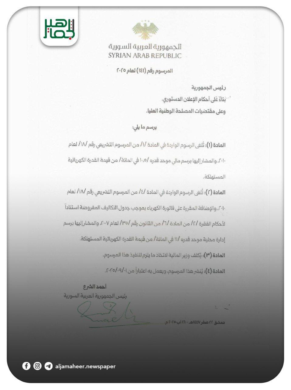 وزارة المالية: تلغى الرسوم الواردة في المادة /1/ من المرسوم التشريعي رقم 18/ لعام 2010 و المشار إليها برسم مالي موحد قدره 10.5 في المائة من قيمة القدرة الكهربائية المستهلكة.