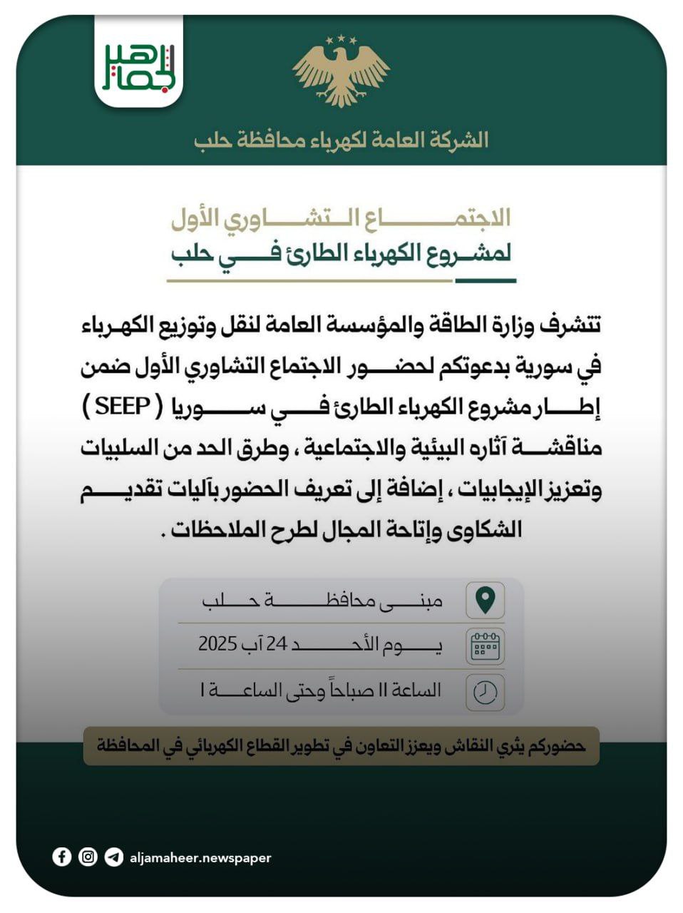 دعوة للمشاركة في الاجتماع التشاوري الأول لمشروع الكهرباء الطارئ في حلب أحدث الأخبارمحليات On أغسطس 23, 2025 Share Share FacebookTwitterGoogle+ReddItWhatsAppPinterestالبريد الإلكتروني