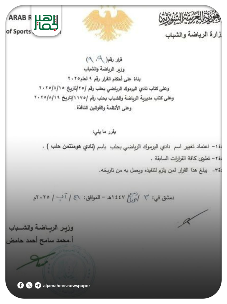 أصدرت وزارة الرياضة والشباب قراراً يقضي بإعادة تسمية نادي اليرموك في مدينة حلب إلى اسمه الأصلي: نادي هومنتمن حلب، وهو الاسم الذي حمله النادي عند تأسيسه عام 1925 على يد أبناء الجالية الأرمنية في المدينة. أحدث الأخباررياضة On أغسطس 27, 2025 Share Share FacebookTwitterGoogle+ReddItWhatsAppPinterestالبريد الإلكتروني