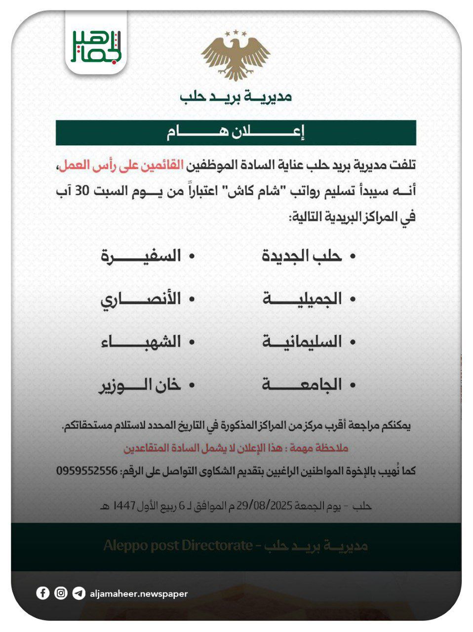 مديرية بريد حلب: محليات On أغسطس 29, 2025 Share 📌بدء تسليم رواتب “شام كاش” للموظفين القائمين على رأس العمل، اعتباراً من يوم السبت 30 آب 2025. 📌 تسليم الرواتب في المراكز البريدية التالية: حلب الجديدة، الجميلية، السليمانية، الجامعة، السفيرة، الأنصاري، الشهباء وخان الوزير. #صحيفة_الجماهير Share FacebookTwitterGoogle+ReddItWhatsAppPinterestالبريد الإلكتروني