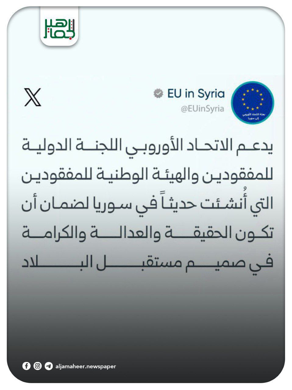 📌 الاتحاد الأوروبي يدعم اللجنة الدولية للمفقودين والهيئة الوطنية للمفقودين التي أُنشئت حديثاً في سورية لضمان أن تكون الحقيقة والعدالة والكرامة في صميم مستقبل البلاد