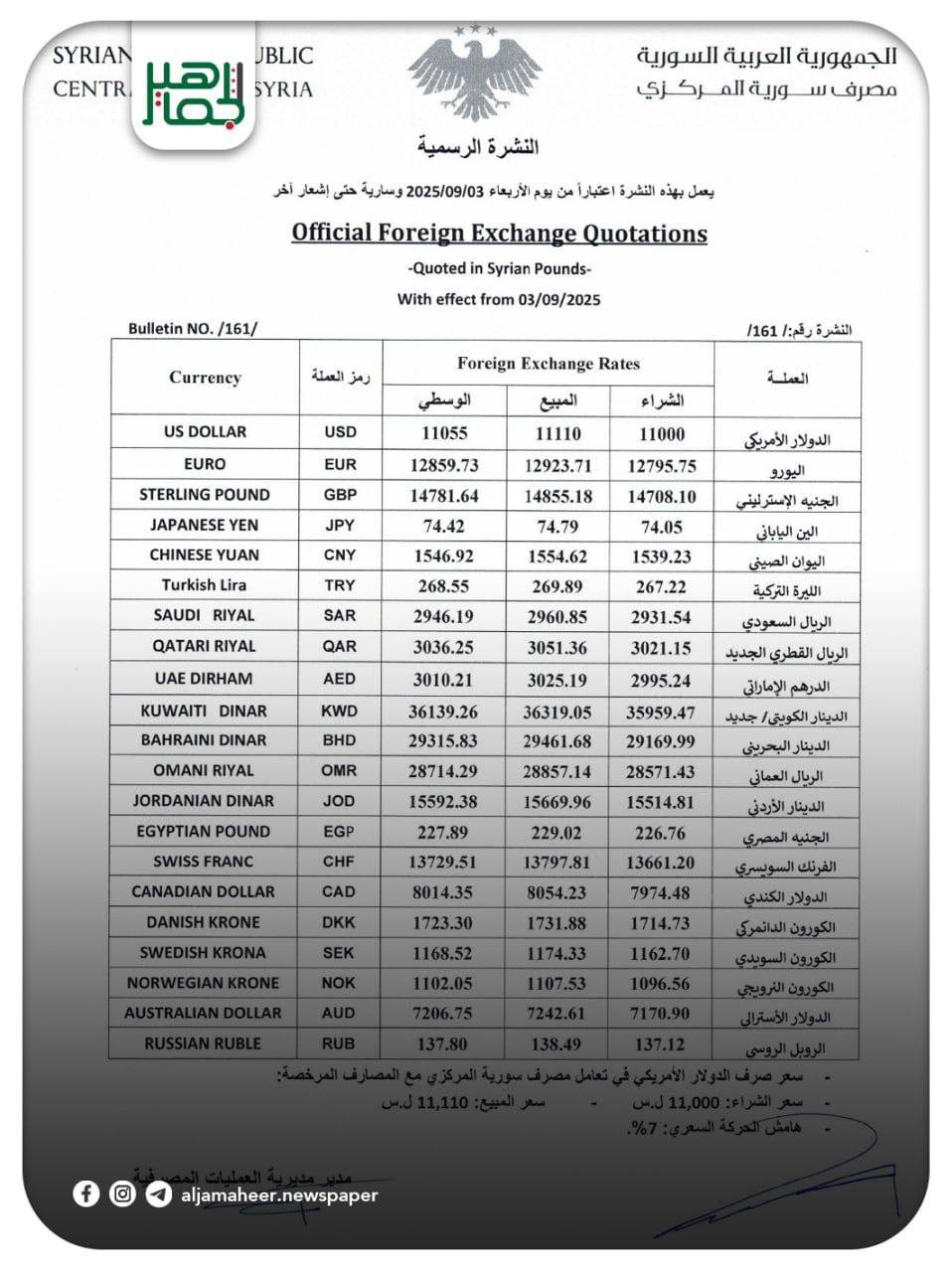 سعر صرف الليرة السورية مقابل العملات الأجنبية والعربية بحسب النشرة الرسمية من مصرف سورية المركزي بتاريخ 3/ 9/ 2025 اقتصاد On سبتمبر 3, 2025 Share #صحيفة_الجماهير Share FacebookTwitterGoogle+ReddItWhatsAppPinterestالبريد الإلكتروني