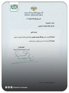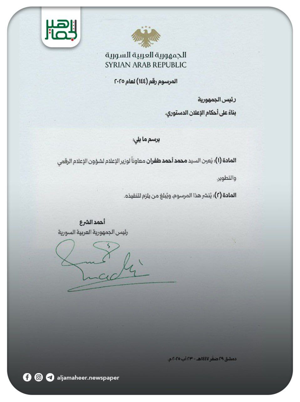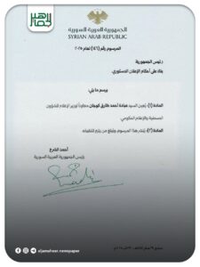 السيد الرئيس أحمد الشرع يصدر مراسيم تقضي بتعيين ثلاثة معاونين لوزير الإعلام وهم: محمد أحمد طفران لشؤون الإعلام الرقمي والتطوير وعبد الله موسى الموسى لشؤون المحتوى وعبادة أحمد طارق كوجان للشؤون الصحفية والإعلام الحكومي. أحدث الأخبار On سبتمبر 5, 2025 Share Share FacebookTwitterGoogle+ReddItWhatsAppPinterestالبريد الإلكتروني