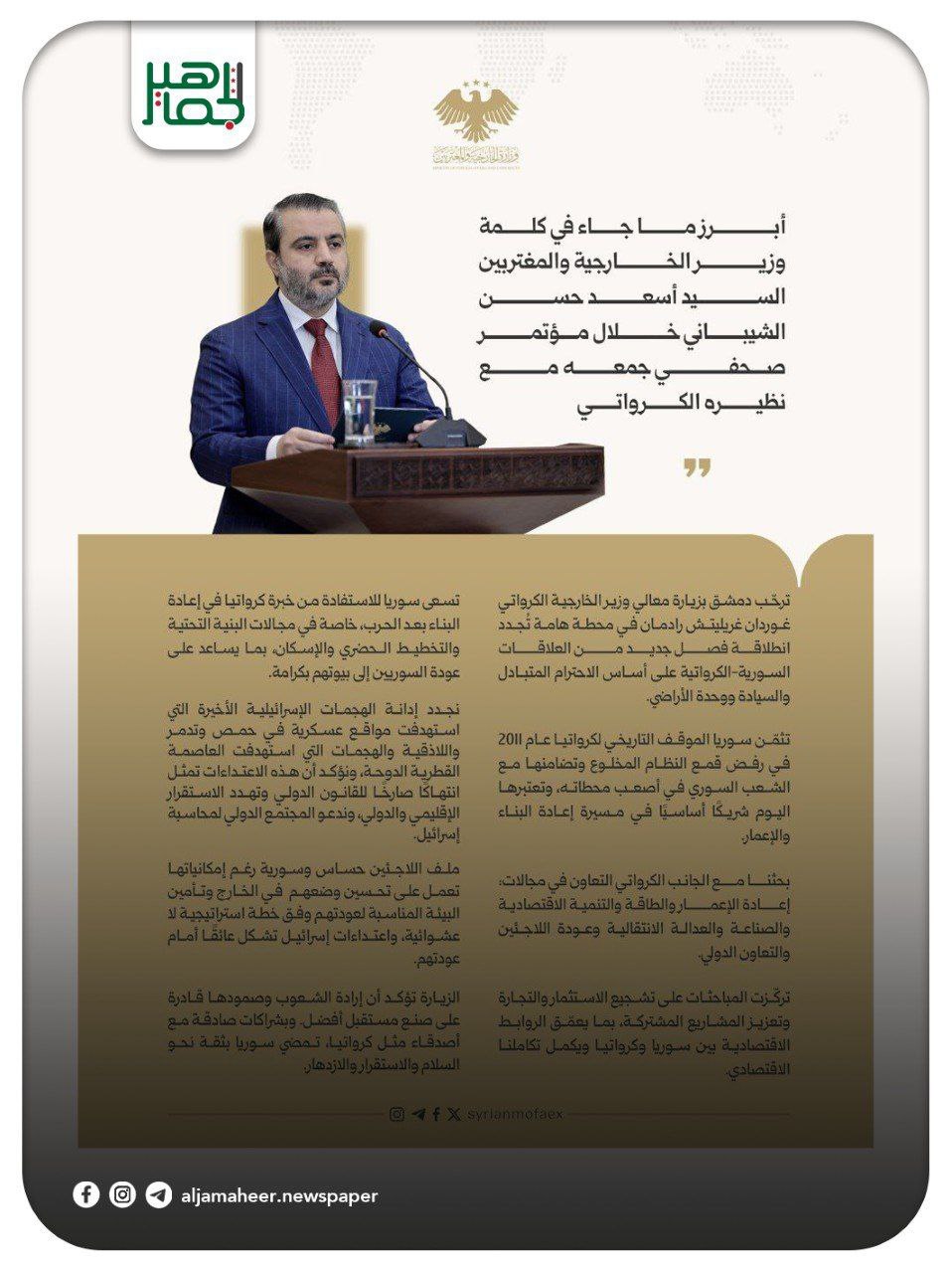 وزارة الخارجية: أبرز ما جاء في كلمة وزير الخارجية والمغتربين أسعد حسن الشيباني خلال مؤتمر جمعه مع نظيره الكرواتي أحدث الأخبار On سبتمبر 11, 2025 Share Share FacebookTwitterGoogle+ReddItWhatsAppPinterestالبريد الإلكتروني