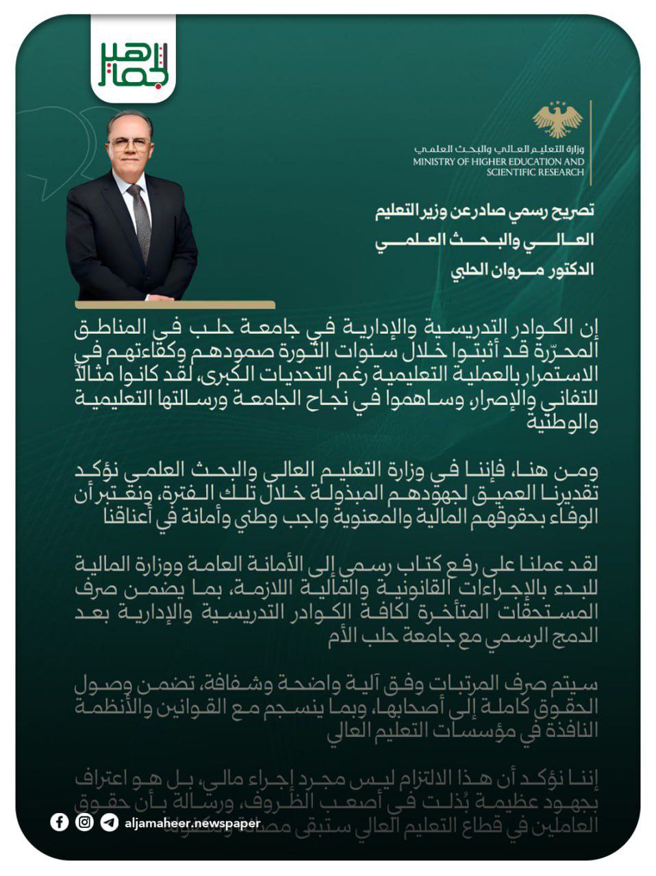 تصريح صادر عن وزير التعليم العالي والبحث العلمي مروان الحلبي، أكد فيه رفع كتاب رسمي إلى الأمانة العامة ووزارة المالية لصرف المستحقات المتأخرة لكافة الكوادر التدريسية والإدارية في جامعة حلب المحررة بعد الدمج الرسمي مع جامعة حلب الأم شباب وجامعات On سبتمبر 11, 2025 Share Share FacebookTwitterGoogle+ReddItWhatsAppPinterestالبريد الإلكتروني