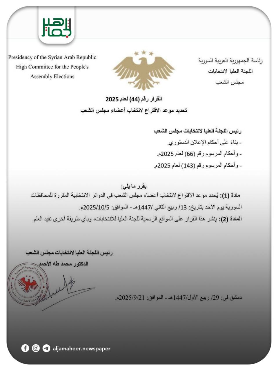 اللجنة العليا لانتخابات مجلس الشعب تُصدر القرار رقم /44/ لعام 2025 والذي يحدد موعد الاقتراع لانتخاب أعضاء مجلس الشعب في سورية محليات On سبتمبر 21, 2025 Share Share FacebookTwitterGoogle+ReddItWhatsAppPinterestالبريد الإلكتروني