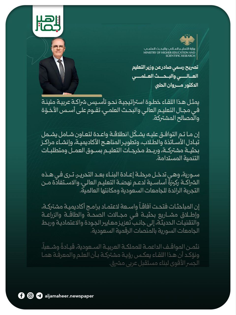 تصريحات وزير التعليم العالي والبحث العلمي الدكتور مروان الحلبي عقب لقائه نظيره في المملكة العربية السعودية. أحدث الأخبارمحليات On سبتمبر 23, 2025 Share Share FacebookTwitterGoogle+ReddItWhatsAppPinterestالبريد الإلكتروني