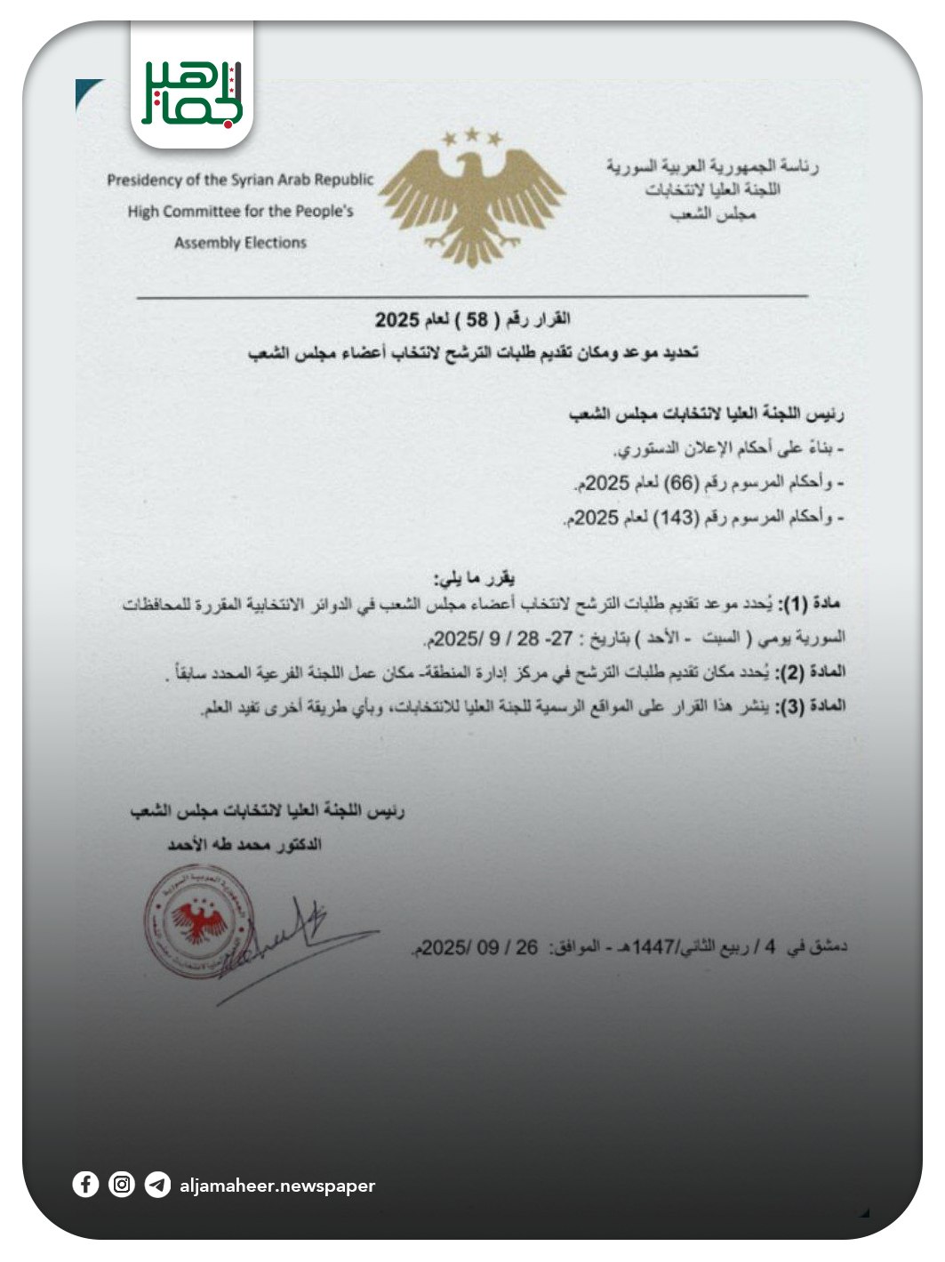 اللجنة العليا لانتخابات مجلس الشعب تحدد يومي 27 و 28 من أيلول الحالي موعداً لتقديم طلبات الترشح للانتخابات، في حين يحدد مركز إدارة المنطقة أو مكان عمل اللجنة الفرعية حيث يمكن تقديم طلبات الترشح. محليات On سبتمبر 27, 2025 Share #صحيفة_الجماهير Share FacebookTwitterGoogle+ReddItWhatsAppPinterestالبريد الإلكتروني