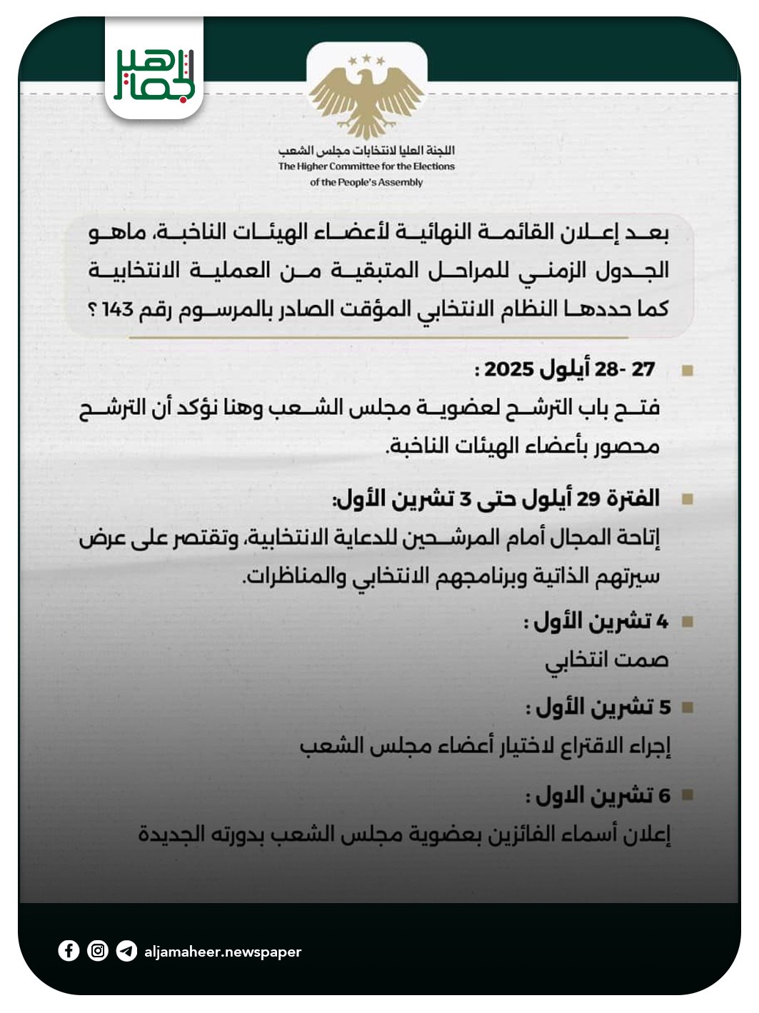 📌 اللجنة العليا لانتخابات مجلس الشعب حددت يومي السبت والأحد لاستقبال طلبات المرشحين الراغبين في خوض المنافسة الانتخابية