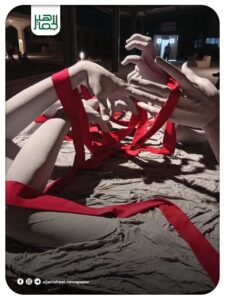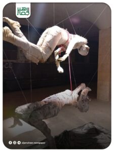 فيما تناولت الفنانة نور كوردي الصراع بين الإنسان وذاته عبر تركيب فني يطرح تساؤلات حول السلطة والتحكم في المصير.